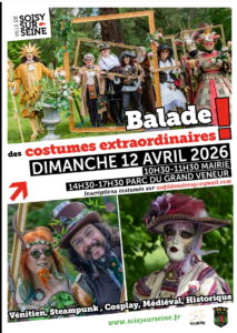 Le 12 Avril : Nous programmons une sortie photo à Soisy sur Seine, pour une balade dans l’univers des costumes extraordinaires (vénitien, steampunk, cosplay, médiéval et historique) de 10h30-11-30 et 14h30-17h30. Possibilité de sortie sur la journée ou sur la demi journée.